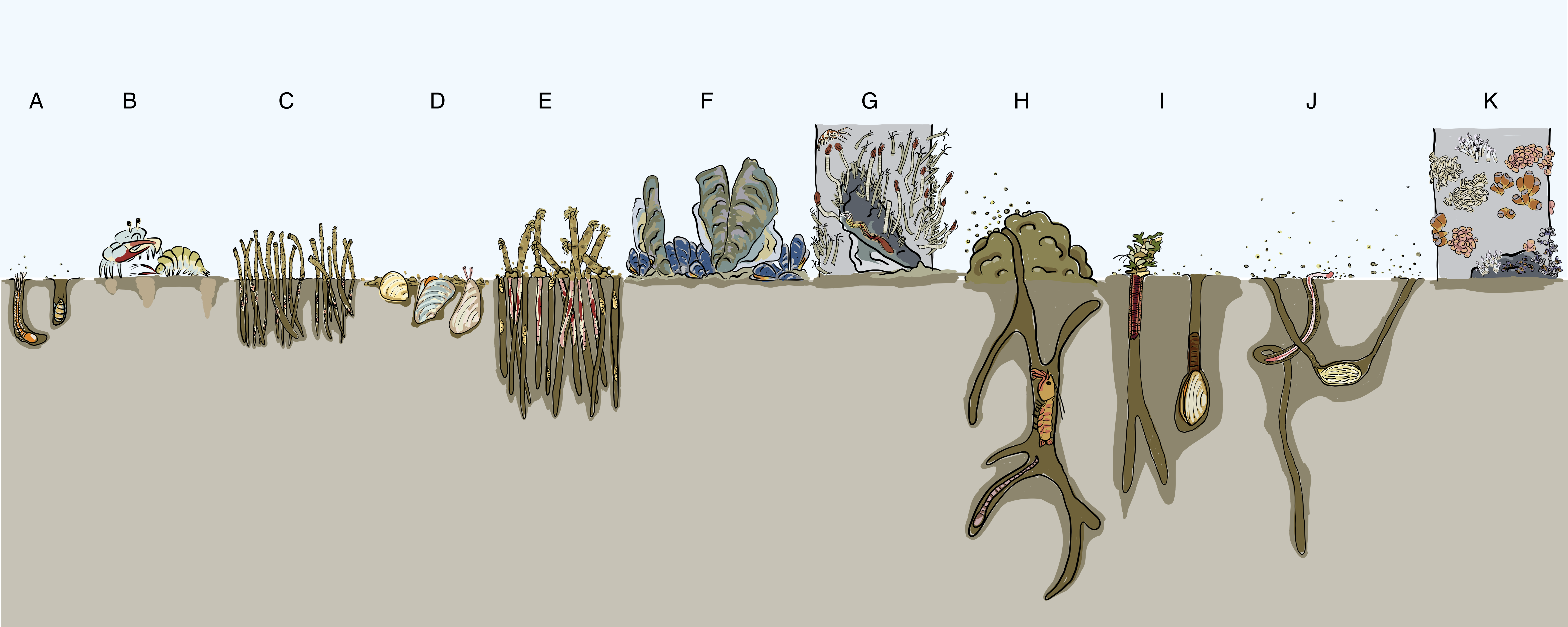 Benthic species (i.e., species that live on and/or in the seafloor sediment) can provide important ecosystem services. For example, because regulate nutrient cycling, or create habitat. For these seafloor dwelling species 15 traits can be distinguished, such as their burrow width, pumping capacity, or the size of the construction that they build. With these traits, benthic species can be clustered into groups, based on their function in the ecosystem (i.e., “functional groups”). The 11 most important benthic functional groups that occur in the North Sea are displayed in the picture below.